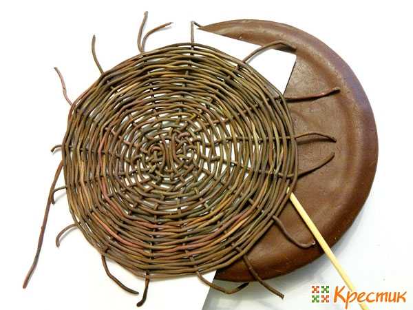 Кончики ниточек разложим ровно по крышечке (как показано на фото выше) и получим шестнадцать «лучиков». Возьмём ещё две ниточки и закрепим на крышечке (прилепим к ней временно). Начнём продевать их по кругу в шахматном порядке. Первую под первым лучиком, а вторую над первым лучиком. Дальше наоборот, первую над вторым лучиком, а вторую под вторым лучиком. Продолжаем в таком порядке плести подобие корзинки.