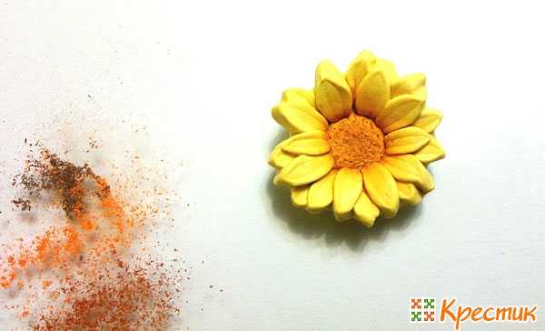 Скатайте толстый белый жгут, нарежьте его на лепестки цветов. Сердцевину создайте так: скатайте шарик желтого цвета, зубочисткой продавите рельеф.