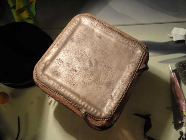 13. После, из темно-коричневой глины раскатала пласт толщиной мм 1,5 (можно и потолще) наложила его на дно банки, обрезала, по краям продекорировала дотсом, а губкой остальную поверхность.