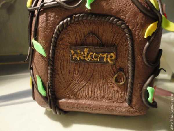 15. Потом приделала дощечку на дверь. Надпись написала акриловым контуром, саму дощечку задекорировала под дерево.
