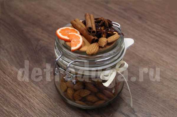 Если вы хотите использовать банку как декор комнаты, можно использовать и настоящие шишки, орехи, стручки корицы и другую атрибутику.