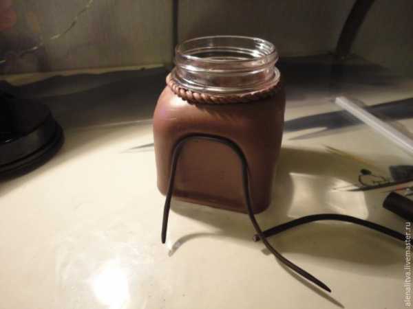 8. Теперь я решила украсить свою баночку. Я накатала несколько колбасок из темно-коричневой глины и в проивольном порядке начала создавать «веточки».