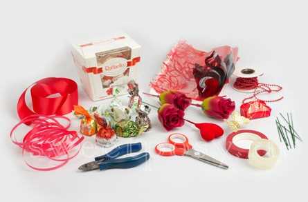 Придется также озаботиться острым ножом, различными предметами декора – сверкающими кристаллами, жемчужинами, стеклярусом, короче говоря, всем, что на ваш взгляд, будет соответствовать вашему маленькому шедевру. Нужно будет так же приобрести клей и самое главное: свежие цветы и декоративную зелень.