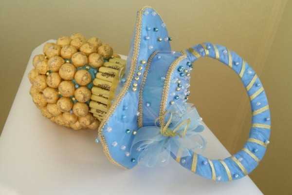 Для декорирования работ могут использоваться листы картона, готовая посуда и плетеные корзинки. Оригинальные букеты из конфет получаются при использовании предметов интерьера, поделок из ткани и прочих ухищрений.