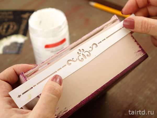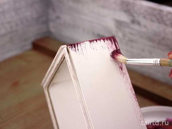 По углам шкатулки наносим полусухой кистью мазки фиолетово-красного цвета. Сушим феном.