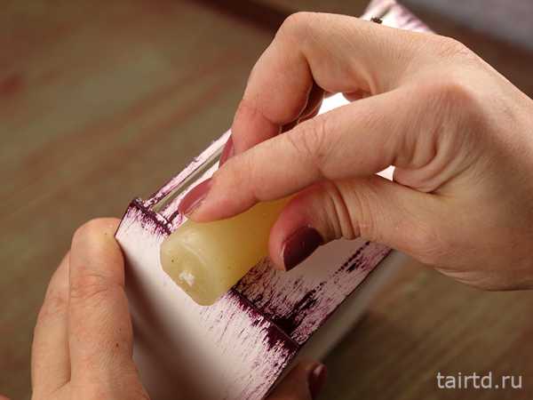 - Переходим к следующему этапу. По периметру всех граней шкатулки проходимся воском. Он не даст краске ровно лечь и создаст видимость протертой поверхности.