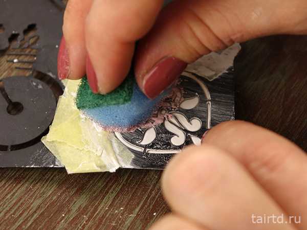 Набираем на губку устрично-бежевый и затамповываем рельефные узоры, снова приложив трафарет. Не стараемся закрасить их полностью, наоборот, оставляем немного белых граней, чтобы узор не потерялся.