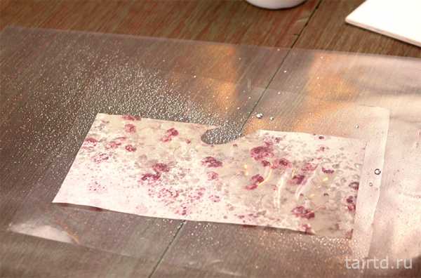 Кладём декупажную карту лицом вниз на канцелярский файл. Смачиваем водой и разглаживаем складки кистью.
