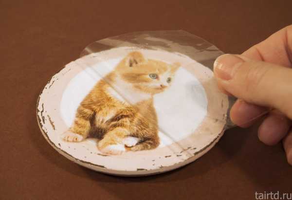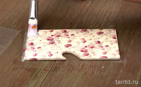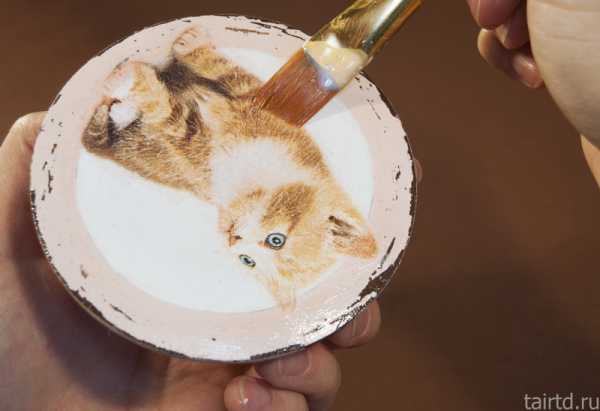 Покрываем поверх декупажной карты клеем-лаком от центра к краям. После высыхания наждачной бумагой или острым канцелярским ножом удаляем излишки бумаги.