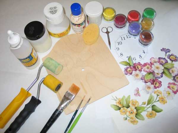 Инструменты для работы в технике декупаж это: острый нож, ножницы, наждак (мелкий). Еще будут нужны: клей ПВА, светлый мебельный лак (алкидный или акриловый), акриловые краски (белая и любая понравившаяся), темная (например коричневая) для грунтовки, воск (можно свечку), кисти (с жесткой щетиной среднего размера), поролоновая губка.