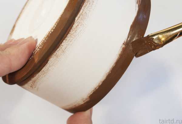 1. Для начала нужно подготовить поверхность к декорированию, т.е. ошкурить.2. Далее мы прокрашиваем углы темно-коричневой краской, просушиваем.