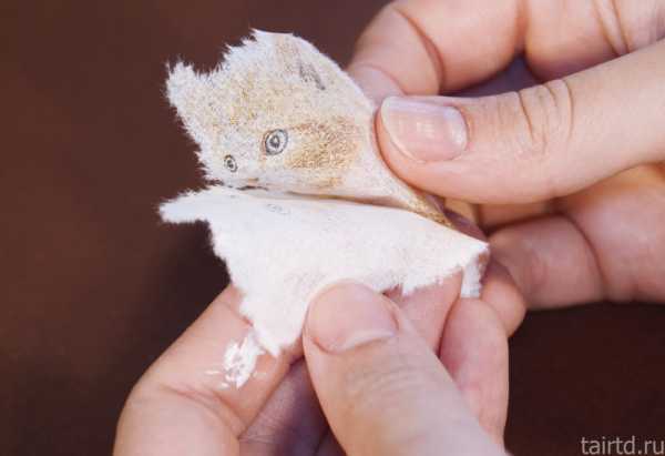 5. Приступаем к декупажу. Вырываем мотив из салфеточки (если вырезать, то границы рисунка будут видны явными). Отделяем верхний красочный слой.