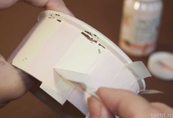По нижнему краю всех боковых граней шкатулки с отступом в 5-7 мм приклеиваем малярный скотч. Набираем на губку фиолетово-красный и отбиваем нижнюю полоску таким цветом. Дно также «затамповываем» фиолетово-красным. Снимаем скотч до высыхания краски.