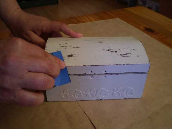 7. После полного высыхания, проходим наждачной бумагой по шкатулке. Там, где была нанесена свечка, слой белой краски сходит. Проявляются лёгкие потёртости и видна нижняя светло-зелёная краска.