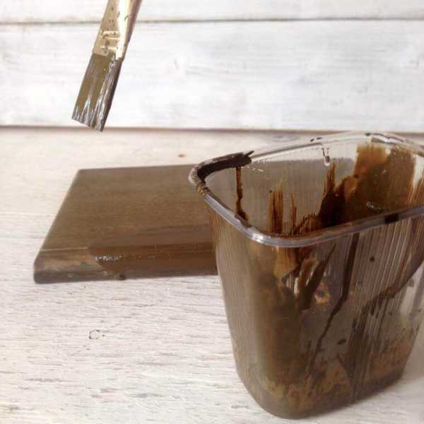 - Теперь нужно подготовить нижний слой под покраску. Он будет создавать эффект потертости по завершении работы. Выбираем краску темного цвета и накладываем на всю внутреннюю и наружную поверхности коробочки. Ждем полного высыхания.