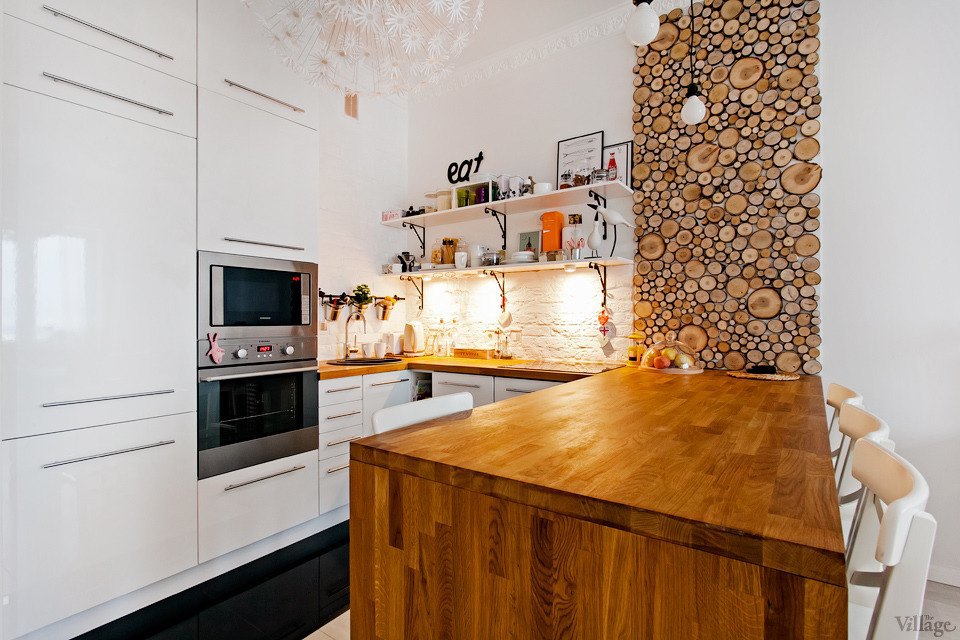 Кухню дополнят причудливые полуциркульные полочки, которые можно сколотить из цельных спилов дерева, разделив их на две части. Создается иллюзия, будто «кругляшек» находится в процессе погружения в стену. Прием интересен, если полка круглая, благодаря этому создается визуальное движение. Эффект достигается из-за динамичного рельефа на коре. На полках гармонично разместятся кулинарные книги, или личные сборники рецептов хозяйки. И выдержит изделие достаточно большой вес, пусть ее размеры могут не внушать доверия.