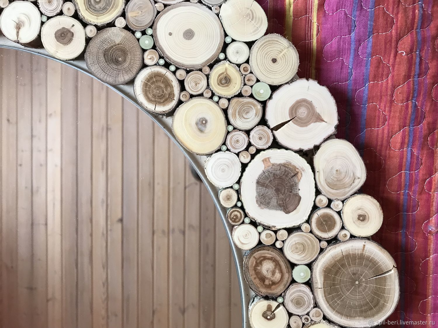 - Рамы для зеркал. В создании изделия важно придерживаться ритмичности или метричности, а вот хаос будет неуместен. Чередуйте большие спилы дерева с маленькими, либо делайте всю раму из окружностей приблизительного размера. Любой из вариантов будет правильным.