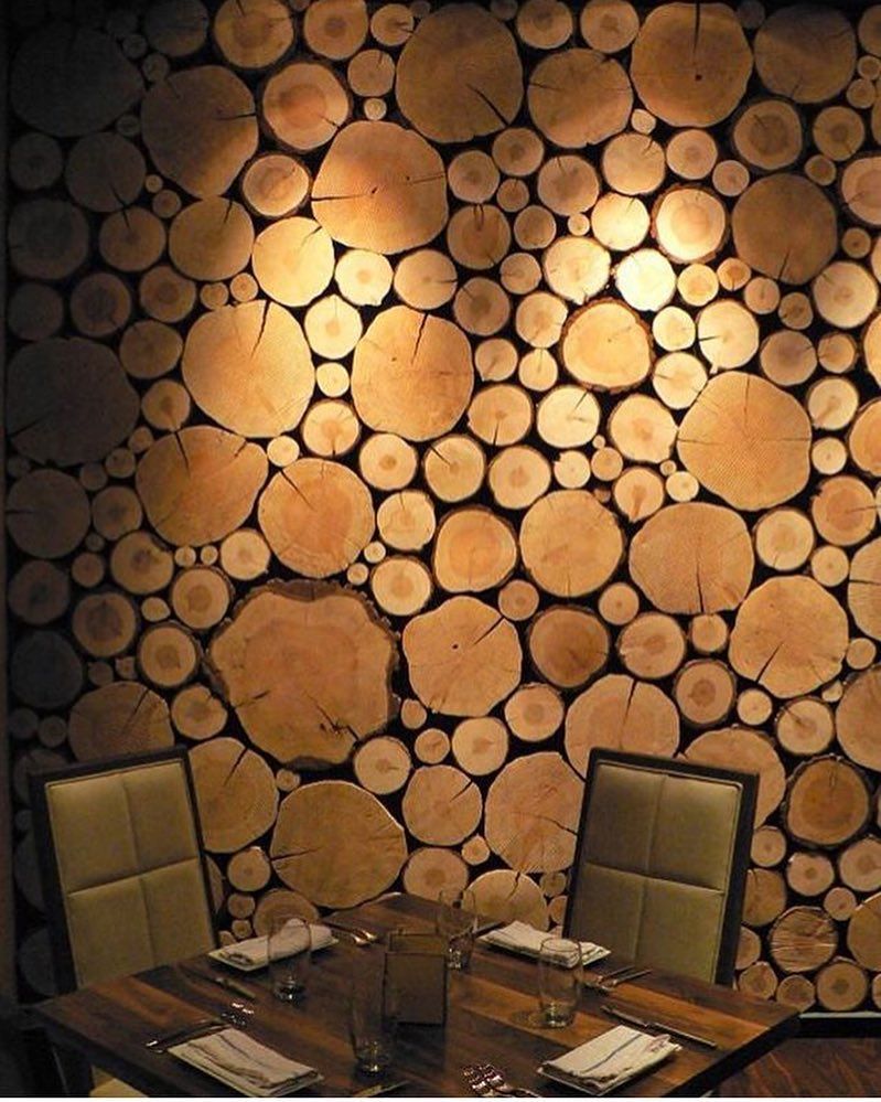 У каждого во дворе находится уже засохшее деревце, которое необходимо убрать. Вот настало время его рубить. Берем ветку, распиливаем ее на бруски средней толщины. Из получившихся «блинов» можно снять кору, а потом отшлифовать. Благодаря чему вы не загоните колючку, прикоснувшись к стене. Полученные древесные пласты следует обработать специальным средством от насекомых, а дальше – сажаем на клей. Желательно покрыть лаком полученный рельеф — покрытая лаком древесина может прослужить долгое время.