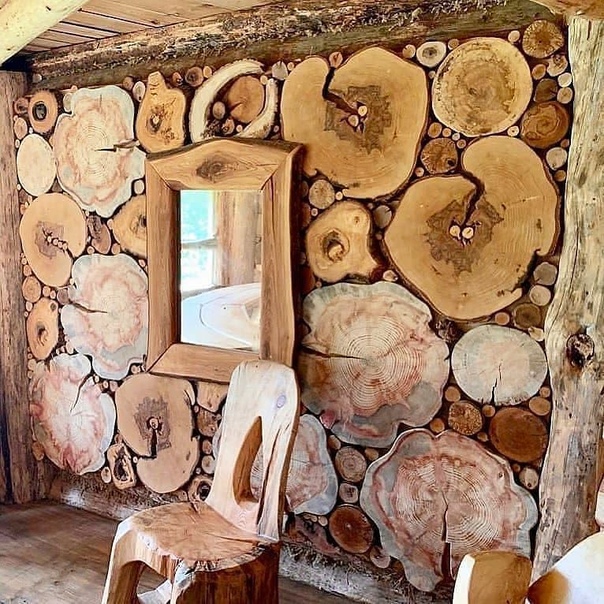 Один из вариантов дизайна в помещении осуществляется с помощью спила дерева. Он в основном используется для загородных домиков или дач, но можно воспользоваться этим вариантом и для декорирования помещения в квартире.