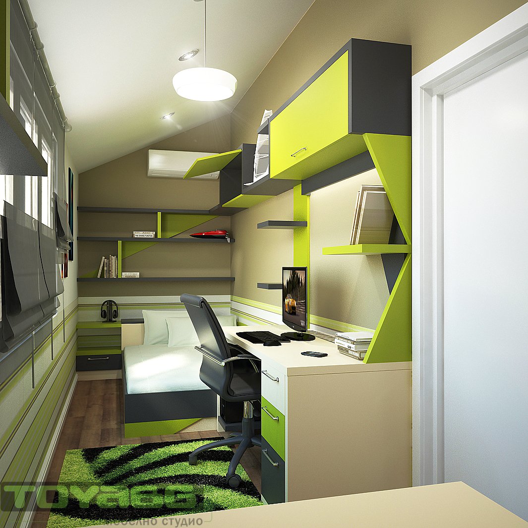 Стол лучше поставить возле окна, кровать расположить вдоль стены, рядом поставить комод для вещей. На одной из стен можно установить турник в виде лестницы, для спортивного развития. Там же будет располагаться зона для игры.