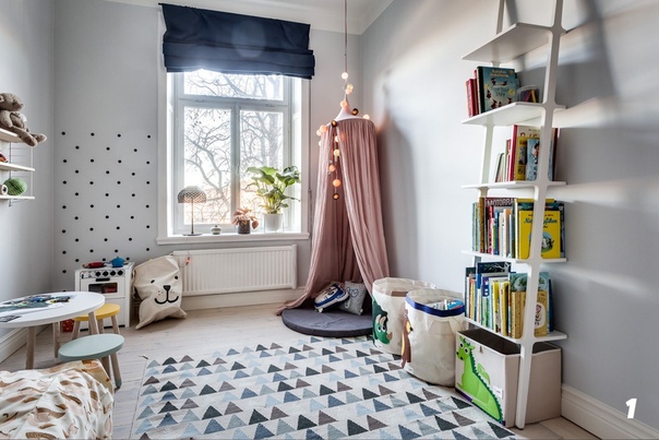 Из комнаты в скандинавском стиле легко сделать именно детскую, используя декоративные элементы: картины и рисунки, игрушки, ковры, пледы. Когда ребенок станет старше, все это легко заменить, и без серьезных трат переделать комнату.