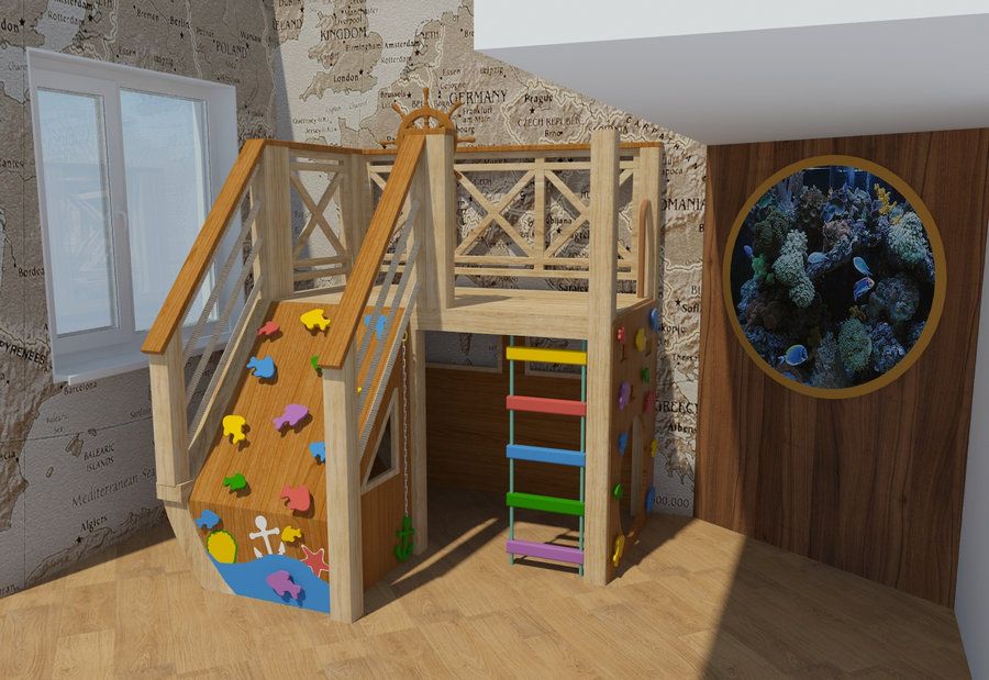 Лучше всего пристраивать горку к двухъярусной кровати. В этом случае она получится более высокой. Но есть интересный вариант и для обычных кроватей: их поднимают выше, устраивая снизу ящики для вещей. В любом случае можно сделать просто горку, идущую от кровати или собрать более сложный вариант с лестницей и площадкой. Сегодня рассмотрим именно его (кстати, если размеры комнаты позволяют, то его можно использовать и как самостоятельный элемент интерьера).