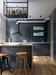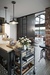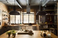 Лучший момент, чтобы сделать лофт в вашей кухне более тёмным. Чёрные трековые светильники, барные стулья, шторы.
