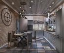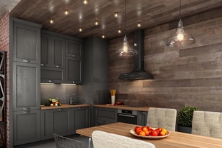 Пепельные оттенки – нефрит, металлик – типичны для производственных помещений. Делает интерьер более теплым керамика – на полу и на фартуке; терракотовый кирпич. Можно использовать обои с имитацией кладки.