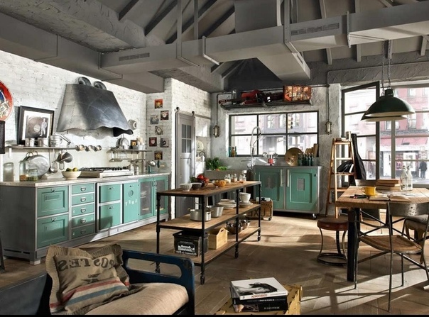 В кухонных помещениях в стиле лофт, в отличие от других интерьеров, использование открытых полок, стеллажей и крючков.Удобство такого решения заключается в том, что вы сразу сможете найти нужный предмет.