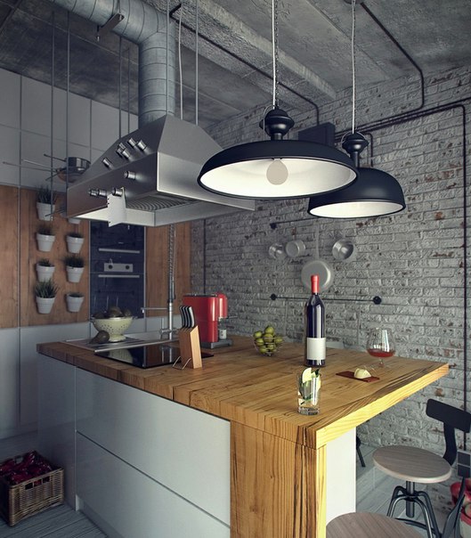 Сейчас хватает недорогих интересных предметов, но придётся поискать. Лофт не про быстро и недорого. - Натуральность и реалистичность. Стиль лофт в интерьере кухни должен производить впечатление «настоящести». Даже если это имитация дерева, камня, предмета из прошлого — не должно быть ощущения, что это бутафория. Антипримеры: обои имитирующие кирпич или бетон, при этом плоские; столешница из ДСП имитирующая камень, при этом на ощупь тёплая и звучит как дерево.