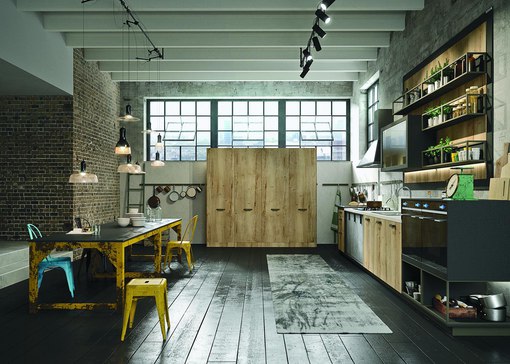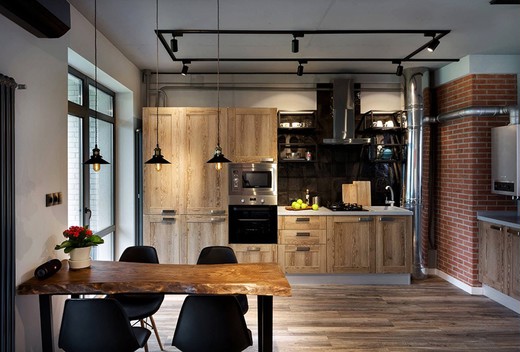 Для обустройства лофт-помещений используют древесину различных пород и фактур: состаренную мебель, потолочные балки и даже дощатый пол. Матовые поверхности гарнитура или другие детали с рисунком древесного среза сделают холодный промышленный интерьер кухни более теплым и уютным.