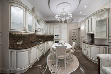 Классический гарнитур может быть строгим или нарядным, но в любом случае у него должны быть филенчатые фасады