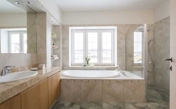 4. Камень – холодный материал, но он может выглядеть очень тепло и уютно, как в интерьере этой ванной комнаты. Главное – подобрать правильный оттенок. Здесь нежно-бежевая отделка стен и ванны чудесно сочетается с деревянной мебелью и несколько более прохладным оттенком пола. Стеклянные душевые конструкции, большое зеркало и окно делают интерьер легковесным и воздушным.