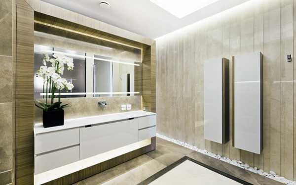 Обшивка стен и потолков санузла камнем – более свежая и оригинальная альтернатива керамической плитке. Отделанные камнем поверхности выглядят статусно, благородно, превосходно защищены от сырости и быстрого износа. В отличие от той же самой плитки, им не грозят сколы и трещины. Производители предлагают широкий выбор облицовок из камня: оникс, мрамор, гранит, песчаник. Но по-настоящему богатой палитрой оттенков удивляет искусственный камень. Сегодня панели из кварцевого агломерата могут имитировать фактуру любого природного камня в широчайшем разнообразии оттенков. Еще одно важное преимущество искусственного камня – возможность создавать целые поверхности без единого шва любых форм и размеров. Таким образом, искусственный камень в ванной комнате с легкостью воплощает даже самые неординарные дизайнерские идеи. Фотоподборка из девятнадцати интерьеров ванных комнат демонстрирует широкие декоративные возможности искусственного камня.