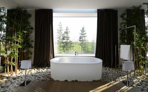 6. Камень в интерьере – это не обязательно полированные, гладкие поверхности. Дизайнеры студии SL project выбрали для своего проекта в загородном доме гальку. Она покрывает пол, сочетаясь с деревянной платформой у ванны в центре. Панорамное окно, бамбук у стен. И ванная комната уже выглядит не как санузел, а как самый настоящий японский сад.