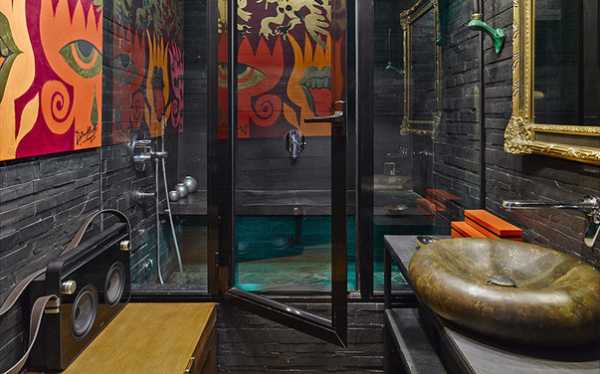 7. Современная ванная комната часто выходит за рамки утилитарности, превращаясь в нечто большее. Например, в экспозицию предметов искусства, как в дизайн-проекте от Аллы Шумейко. Темно-серый рельефный камень стен стал превосходным фоном для ярких авангардных картин, необычной сантехники и аксессуаров.