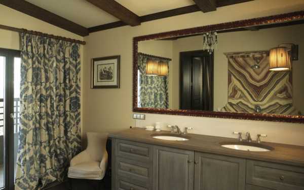 Гармония камня и дереваЕсли полностью отделанная плиткой под дерево ванная напоминает вам русскую баню, из-за чего вы испытываете угнетение, то пусть в комнате будут лишь отдельные деревянные элементы. Это могут быть пол и панели или только тумбочка под раковину и подвесные шкафчики, может быть, зеркало с резной рамой. Дерево хорошо сочетается с природным камнем и мозаикой.