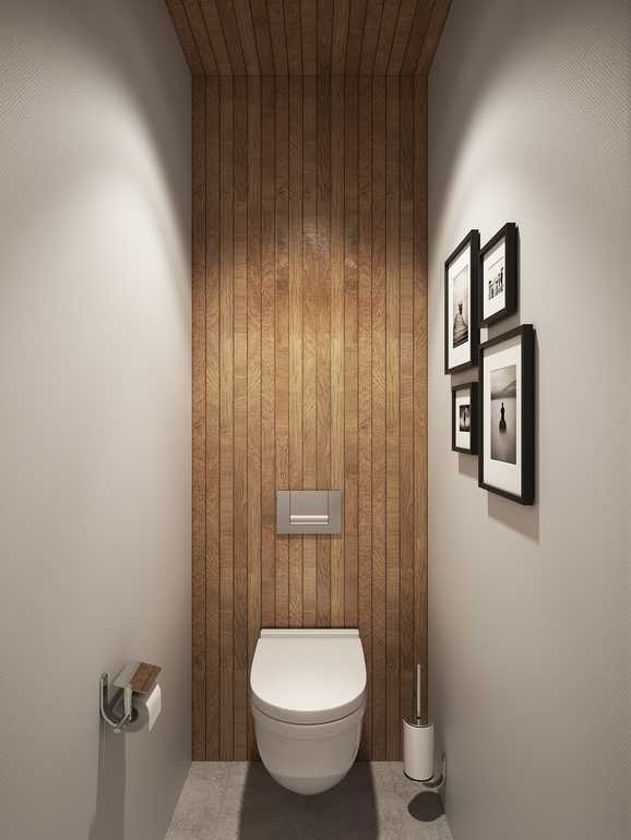 За счет правильного и аккуратного оформления поверхностей, интерьер туалета, приобретает не только опрятный, но и более продуманный внешний облик. Облицовка под дерево является практичным решением, отличается легким уходом и позволяет наделить обстановку домашним уютом, комфортом и вместе с тем лоском и респектабельностью.
