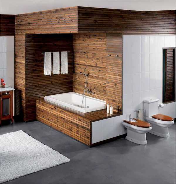 Почти любые породы дерева подойдут для интерьера ванной комнаты – дуб, лиственница, тик, все они по-своему хороши и каждая порода обладает специфической расцветкой, что дает нам возможность подобрать самую необходимую. Теплый бежевый или насыщенный горький шоколад прекрасно дополнят любую, особенно белоснежную ванную.