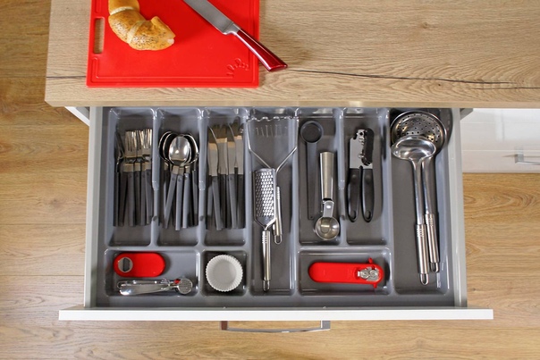 Остальная мелочевка, как правило, хранится в выдвижных ящиках, и что бы в ящиках не устраивать кучу-малу из всего этого обилия столовых и кухонных приборов, существует специальный лоток для столовых приборов в ящик.