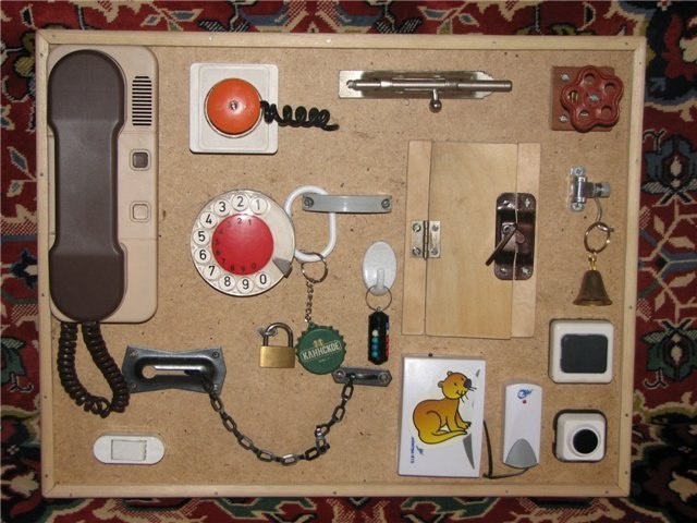 - Бизиборд. В последнее время популярное пособие для развития мелкой моторики. Представляет собой деревянную конструкцию, на которую с двух сторон прикрепляют различные предметы.