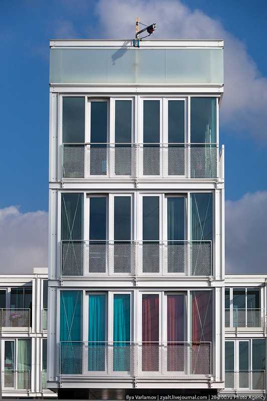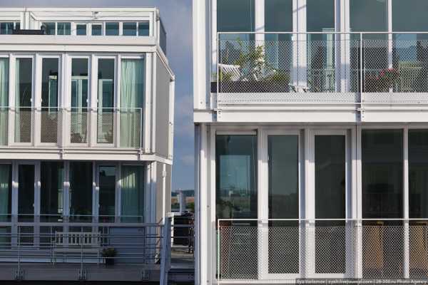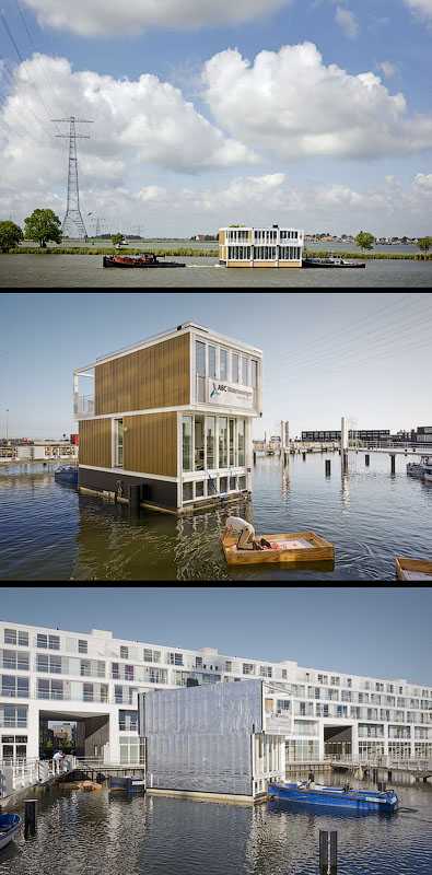 Проект архитектора Marlies Rohmer (www.rohmer.nl). Дома были спроектированы в 2001 году, а квартал доставили с верфи в 2009. Стоимость строительства 1000 евро за кв. метр.