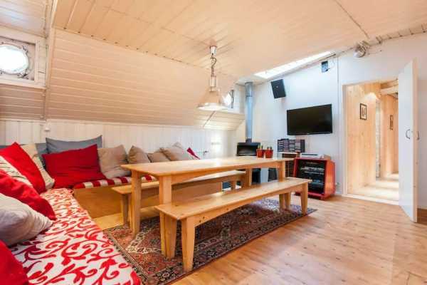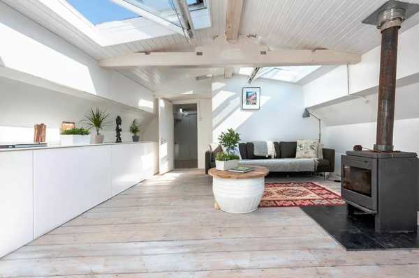 Внутри словно оказываешься в деревенском голландском домике: стоит чугунная печь в гостиной, украшенная плиткой небесного цвета, на полу лежат шкуры и милые коврики, стены и потолок обшиты деревом. Вот она, настоящая домашняя атмосфера!