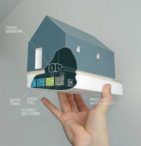 Плавающий дом состоит из бетонного поддона высотой около полутора метров, на нем ставят деревянный каркас, который облицовывают стендовыми панелями. Бетонные коробки пришвартованы к пирсам.