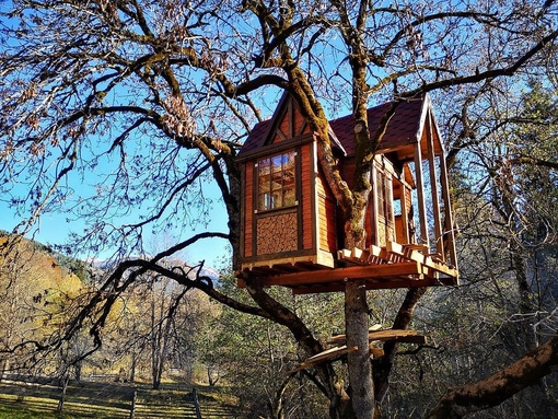 Если же подходящего крепкого растения нет, домик строят на высоких сваях под кроной яблонь или других плодовых деревьев, используя их как декор или как одну из несущих опор.