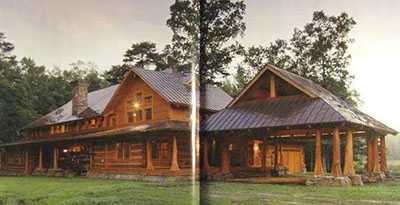 Наличие больших оконных проемов с переплетами уравновешивает природную внешнюю грубость стилистики рустик и придает всей конструкции дома большей легкости, а внутренним помещениям больше света. В результате получается эффектный элитный деревянный дом из рубленого дерева, в архитектурной стилистике которого все выверено и гармонизировано. Окна в таком доме различной формы и различного размера. Центральный фронтон, украшенный большим ступенчатым окном. От него в разные стороны идут узкие ленточные окна. Крыши дома двускатной и вальмовой формы крыты листовым металлом, который гармонично сочетается с массивом дерева. В нем отражаются после дождя облака и деревья ближайшего леса. Еще одной специфической архитектурной деталью являются большие обработанные стволы деревьев, которые украшают внешний фасад и внутренние интерьеры деревянной усадьбы. Стволы, очищенные от коры, выступают в качестве опорных конструкций, а также в качестве декоративных деталей внутри помещений.