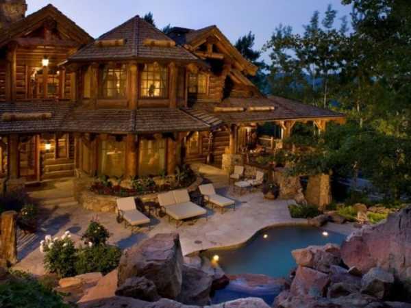 Стиль рустик, который с французского переводится как грубый, деревенский, сельский, приобретает сегодня особую популярность в оформлении жилого пространства. Особенно большим спросом пользуется сегодня деревянный дом, решенный в такой стилистике, эффектно подчеркивающей гармоничность и совершенство натуральных природных материалов, таких как дерево и камень. Представленный на фото дом является уникальным проектом, решенным именно в такой стилистике. Сруб состоит из деревянных конструкций, имеющих нестандартно большие пролеты. Это настоящий загородный особняк, площадь которого составляет 543м2. Высота потолка в основном двухсветном зале составляет 8 метров. Рядом с домом располагаются автомобильная парковка, выполненная из массивных стволов деревьев, зачищенных от коры. Низкие уютные спальни на втором этаже, терраса и хозяйственная постройка, все это создает визуальное архитектурное единство, а не смотрится разрозненными жилыми и хозяйственными постройками. Это единый архитектурный комплекс, состоящий из различных элементов разного объема, пропорции и соотношение которых с высокой точностью выверены профессиональными архитекторами и дизайнерами.