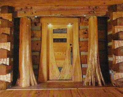 Ствол просто очищен от коры и больше не подвергался обработке. Поэтому в нем сохранилась пластика живого дерева. Такие стволы органично сочетаются с растущим вокруг дома лесом. Создается впечатление, что эти стволы как будто проросли сквозь фундамент деревянного дома и стремятся прорости сквозь крышу, являясь частью растущего поблизости леса. В результате деревянный дом становится органичной частью окружающей среды, в данном случае леса.