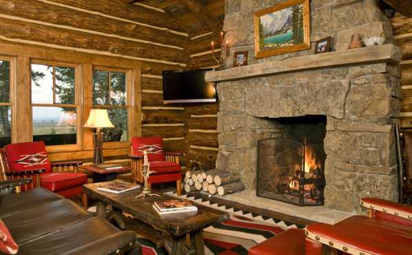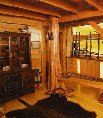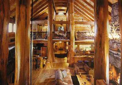 На втором этаже помещения гораздо меньше площади, во многом благодаря тому, что их площадь поглощает огромная двухсветная гостиная. На втором этаже деревянного дома расположены две спальни, ванная комната, а также специальная комната для отдыха, которая размещается над гаражом. Чтобы попасть на второй этаж, придется подняться по лестнице.Для создания внутреннего дизайна такого дома использовалось не только дерево, но и камень. В результате природные материалы эффектно подчеркивают внутреннюю энергетику дома и специфику стиля рустик. Центральным местом интерьера является огромная гостиная с крупным камином, сложенным, как и фундамент, из дикого камня. Когда камин разожжен, то возникает ощущение того, что ты попал в какую-то очень древнюю сказку. Массивные люстры из оленьих рогов свисают на массивных металлических цепях и эффектно подчеркивают восьмиметровую высоту гостиной. Бревенчатые стены главного помещения украшены гобеленами с лесными пейзажами.