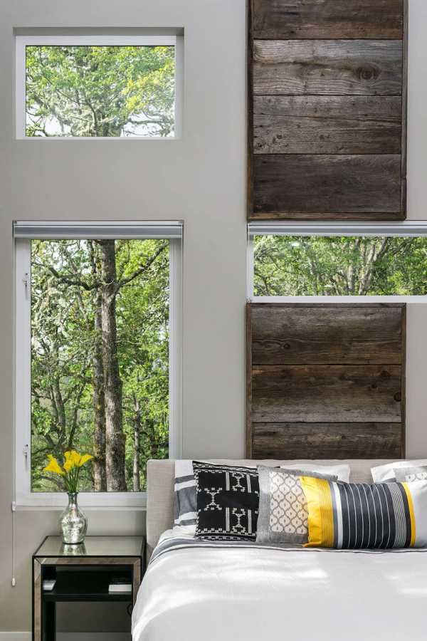 На чердаке расположена учебная зона для сыновей хозяев, а также библиотека и подвесные книжные шкафы, изготовленные Kustom Krafts Cabinets. Наверху, в спальне родителей преобладают элементы из дерева, а узкие окна выходят на боковой двор. «Спальня задумывалась в минималистическом стиле с туалетными столиками из кварцевого камня, раковиной и обогреваемым кафельным полом», говорит Иверсон. Узкие матовые окна создают атмосферу уединения и интимности. В душевой, вымощенной булыжником, расположена тиковая скамья.